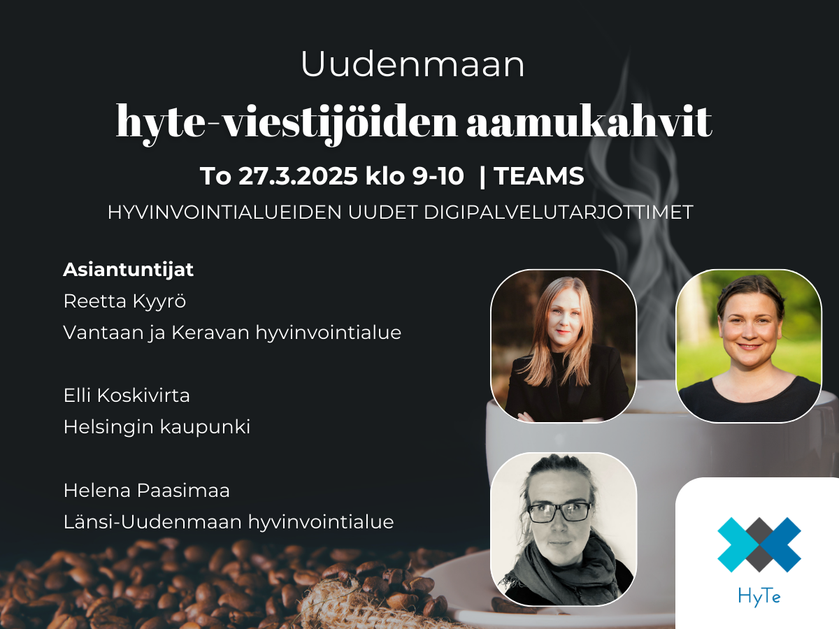 Tervetuloa Uudenmaan hyte-viestijöiden aamukahveille to 27.3. klo 9–10! Maaliskuun aamukahvien teemana on hyvinvointialueiden uudet digipalvelutarjottimet. Aiheesta ovat kertomassa Länsi-Uudenmaan, Vantaan ja Keravan hyvinvointialueiden sekä Helsingin kaupungin edustajat.